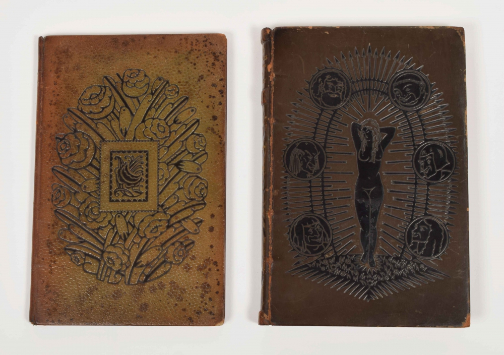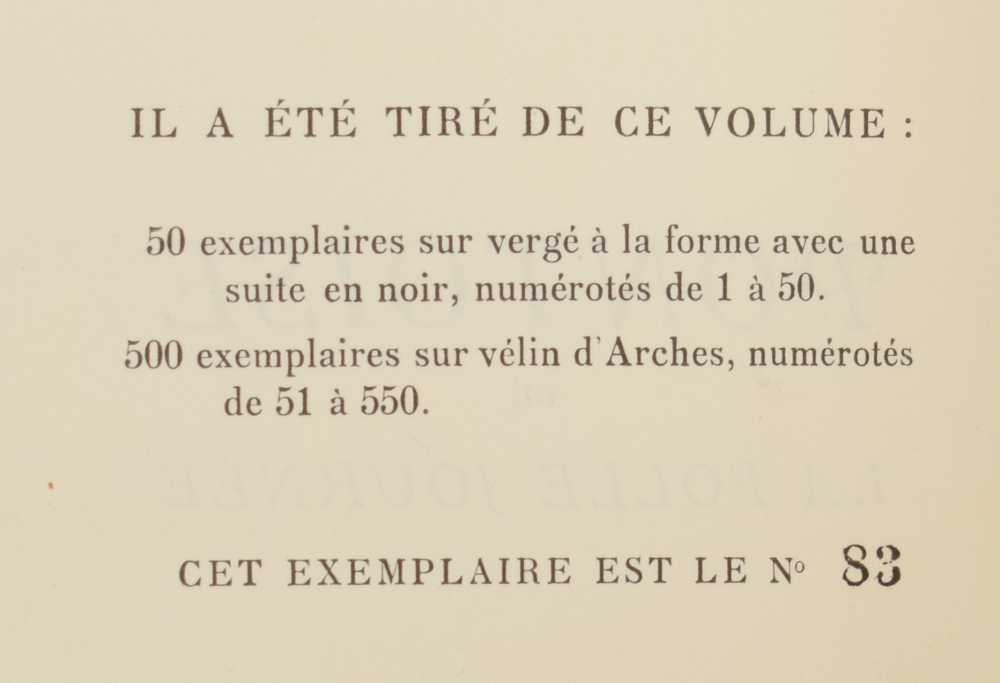 Inside a very clean and untrimmed copy. Binding with wear to joints, corners and spine ends; (2) Pontoise ou La folle journée. Par Paul Fort. Orné d'illustrations de E. Legrand. Paris, R. Kieffer, 1920, printed in 550 numbered copies (this is no. 83, one of 500 copies on Arches), (4),55,(1) p., with coloured illustrations after Legrand, finely bound in full tooled green leather by Kieffer (label to endpaper), bound with original wrapper, top edge gilt, 4to. Binding with stains/ discolouring, joints fragile. (total 2)