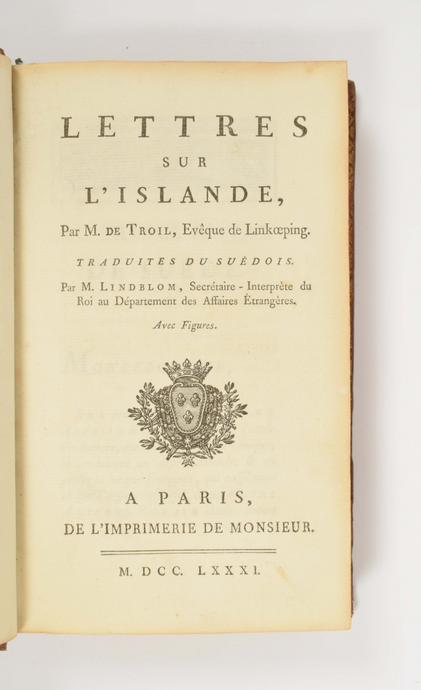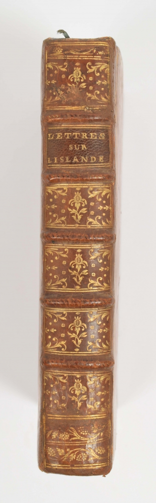 Traduites du Suédois par M. Lindblom. Avec figures. Paris, de l'Imprimerie de Monsieur, 1781, XLVIII,474 p., with the following (large) folding engravings: map of Iceland (25.5 x 33 cm.), 1 other folding map and views of a geyser, the Boo-Shala peninsula and the cave of Fingal at Staffa, 1 folding letterpress table, contemporary gilt calf, boards with gilt borders on inside and outside, gilt and ribbed back with morocco letterpiece, all edges gilt.