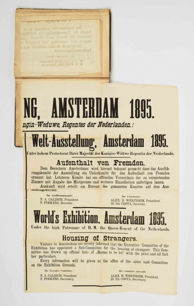 Folio scrapbook with among other things the Algemeen Programma, request forms for placing in Dutch, French, German and English, general regulations, registration forms, admission tickets, day and month tickets; several folded posters in various sizes and colours and other announcements, notices and forms, mostly related to the organisation of the fair at Amsterdam, 1895.