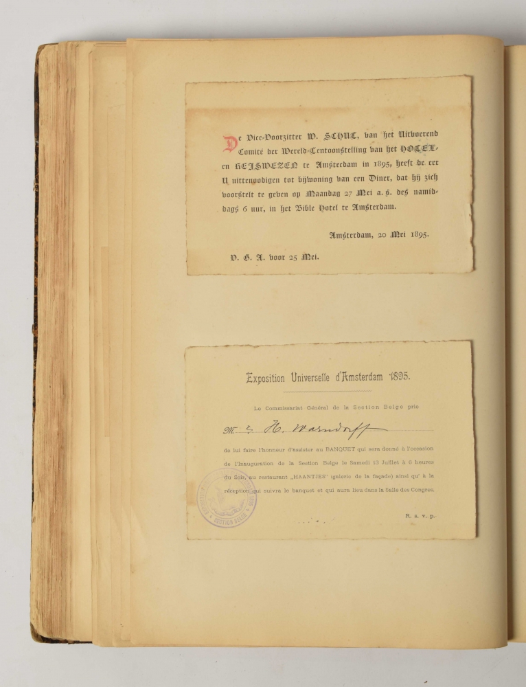 The last leaves with various invitations addressed to H. Warnsdorff, printed and in manuscript and mostly signed by members of the executive committee. The album was probably compiled by H. Warnsdorff with his stamp to front board and endpaper. Lacks spine. The ensemble presents an interesting view of the organisation of a large international event in Amsterdam at the end of the 19th century.