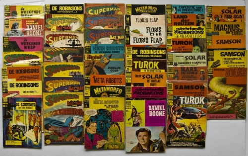See the Dutch description: Lot met 26 delen uit de serie, o.a. Doctor Solar en Samson + 10 delen van het Superman maandblad 1966-1970 - en 9 andere. Meest in (redelijk) goede staat.