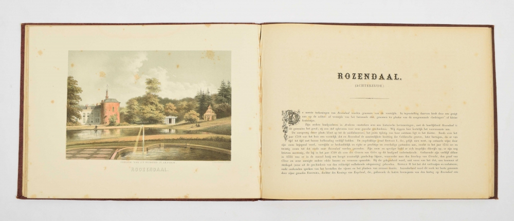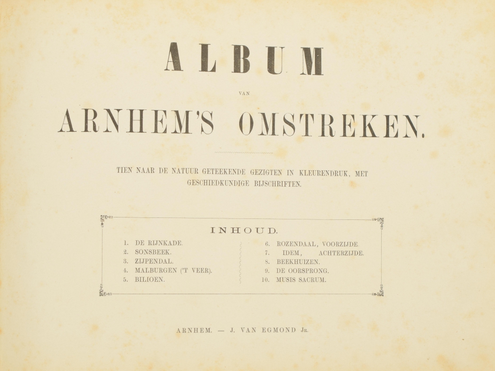 Tien naar de natuur geteekende gezigten in kleurendruk, met geschiedkundige bijschriften. Arnhem, J. van Egmond Jr., c. 1860. In orig. cloth. 22 x 30 cm. With 10 plates. Small damp stain to top of first plate, elsewhere a small damp stain to margin, else good.