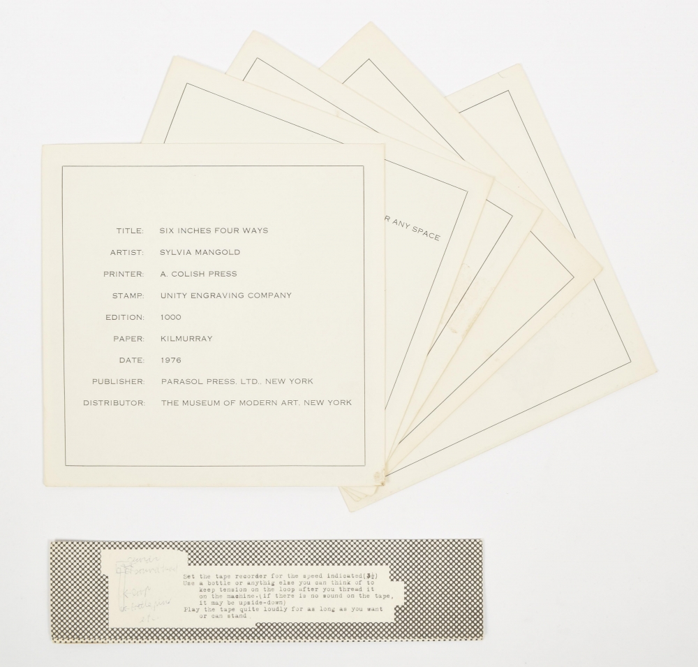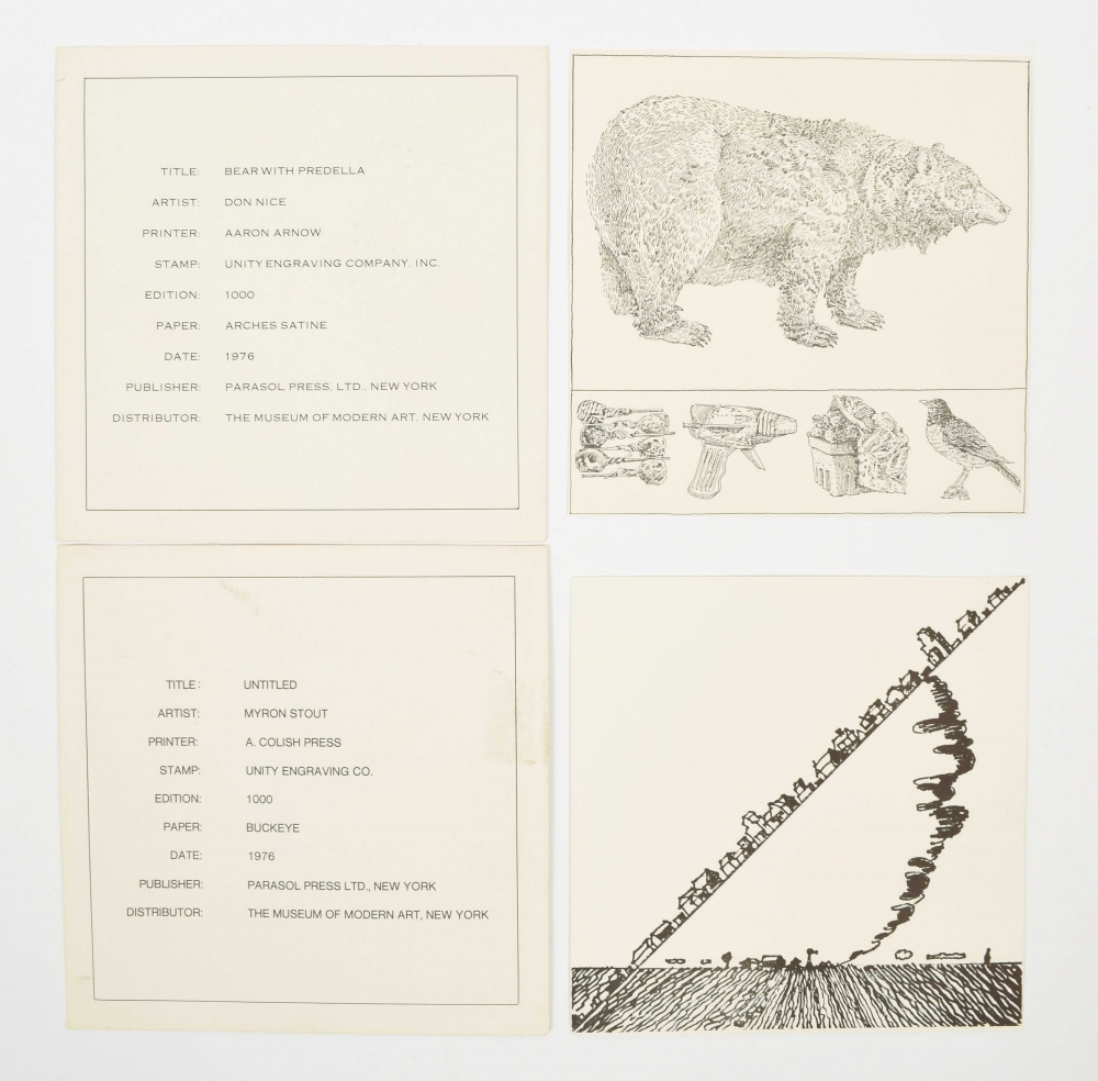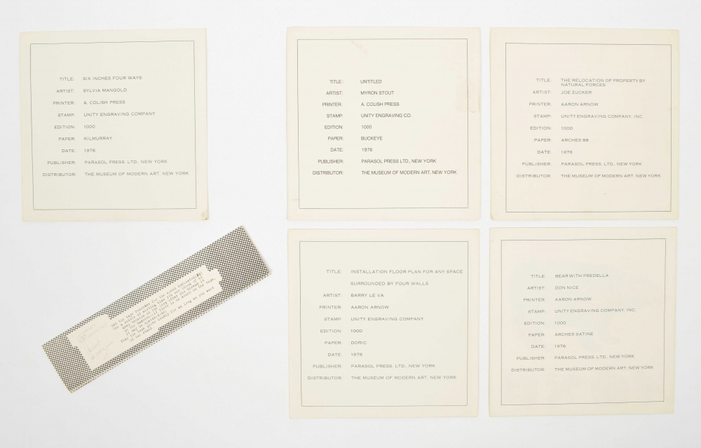 Parasol Press Ltd., New York, distributor MOMA, 1976. 5 (from a series of 12) relief prints, edition of 1000, complete in original envelope: The relocation of property by natural forces, Joe Zucker; Untitled, Myron Stout; Installation floor plan for any space surrounded by four walls, Barry le Va; Six inches four ways, Sylvia Mangold; Bear with Predella, Don Nice.