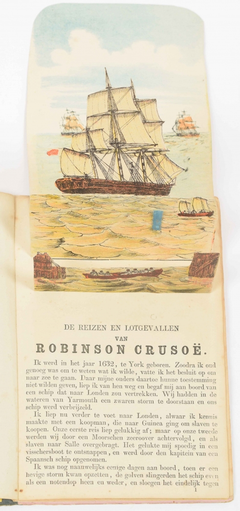 The Hague, Gebroeders Belinfante, 1865. 8 text p. and at the top of the text leaf illustrations, each consisting of three cut-out handcoloured lithographs, connected by a ribbon, standing in a row when folded upwards. Bookblock sl. shaky in binding, else a clean copy of this rare work, all lithographs in good condition.