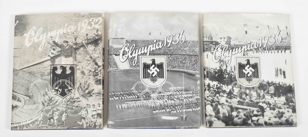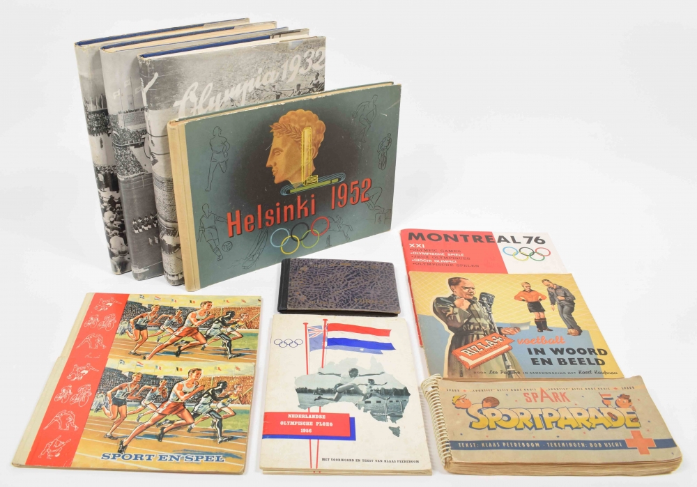 Turmac Olympiade Herinnering. 1928. Oblong halfcloth album with 69 (of 72) zijdjes. Binding worn, else good + Montreal 76. XXI Olympic Games. Panini. Complete + Olympiade 1936. Cigaretten-Bilderdienst Hamburg-Bahrenfeld. 3 vols. bound with dust jacket. Complete with all cards - and 7 more.