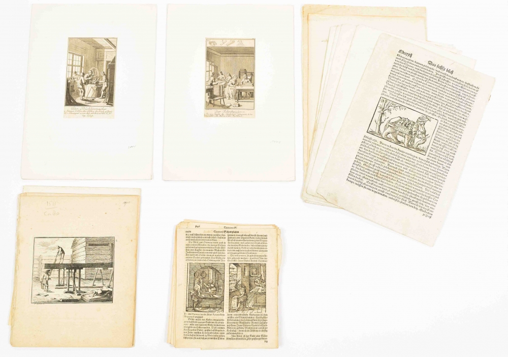 most in woodcut and several in copper and steel engraving. The woodcut leaves from Sebastiaan Münster, Cosmographie (before 1628) and Tomaso Garzoni, Piazza Universale (Allgem. Schauplatz), 1659. Copper engravings 17th and 18th century. Added various later steel engravings (19th century).