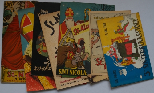 See the Dutch description: St. Nicolaas in sprookjesland verteld door Nelly Donker, Mulder & Zoon, ca. 1955 + Sint Niklaas, 19 okt. 1958. 3e Sinterklaasstoet - en 6 andere boekjes mbt Sinterklaas