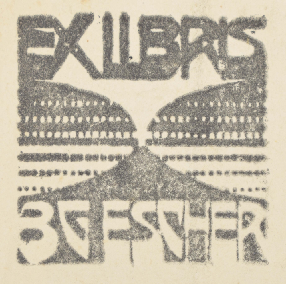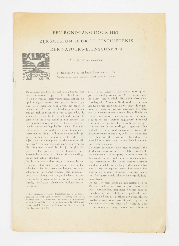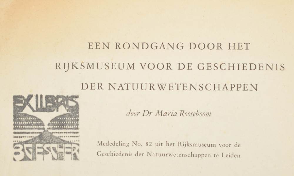 Ex libris B.G. Escher. Woodcut, 30 x 30 mm. On "Mededeling no 82, Rijksmuseum voor de geschiedenis der Natuurwetenschappen te Leiden". Bool 91.