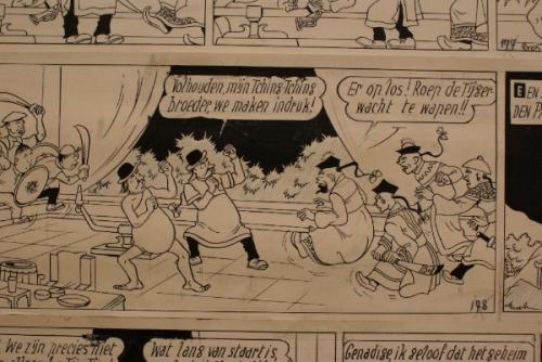 See the Dutch description: Gepubliceerd in 1948. Oost-Indische inkt. Strook 176-180 waarin Lambik en zijn broer temidden van het strijdgewoel in de Gouden Pagode het geheime wapen van de Witte Uil zoeken. 45 x 34 cm in passe-partout.