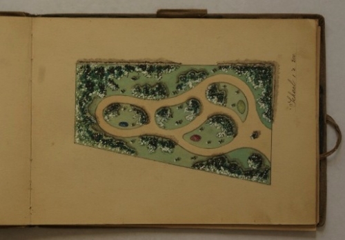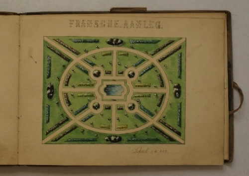 See the Dutch description: Zelfgemaakt album, 19e eeuw. Op eerste pag. geschreven: Eigenaar J.C. Swart, Pijnacker, Boomkweeker. Gekregen van Mevr. Lindenburg. Oblong album 43 p. met 17 handgetekende- en gekleurde bovenaanzichten van tuinen, in gemengde techniek.