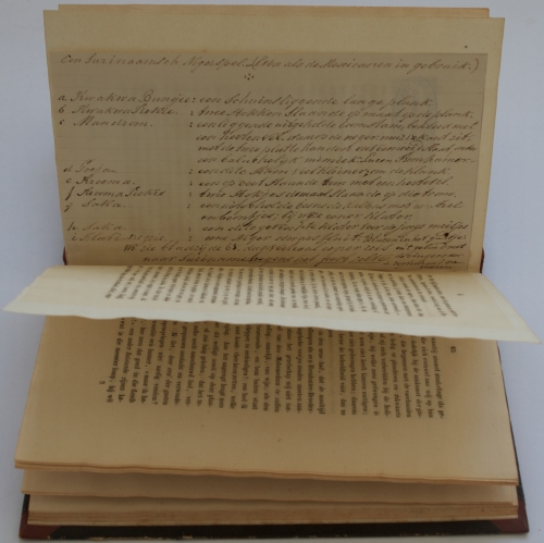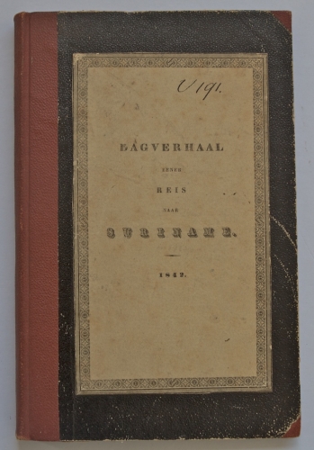 See the Dutch description: Gaspard Philippe Charles van Breugel, C.G. Sulpke, 1842. IV, 122, (4) p. Met 2 handgeschreven meegebonden pagina's; de een met de uitleg van een Surinaamsch Negerspel, de ander met verantwoording "In het jaar 1874 is door mij aan het Koloniaal Museum op het Pavillioen te Haarlem ten geschenke gegeven (..) de publieke verkoopingen, die ik daar wel bijwoonde van Inboedels: meubels, Vee, en Slaven en Slavinnen, daar zulks na de afschaffing der Slavenstand thans steeds nog al curieus blijft eens na te lezen".