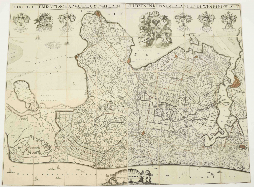 ende West-Frieslant." Wall map by J.J. Dou, engraved by K. Dekker and A. Deur, 88 x 114 cm., edition c. 1780, mounted on cloth in 40 segments, with 6 coats of arms of the Hoogheemraden and 1 larger coat of arms in the upper sections, cartouche with scale in tail margin, the cities (Amsterdam, Haarlem, Enkhuizen, Hoorn, Alkmaar etc.) coloured red and connected with red lines.