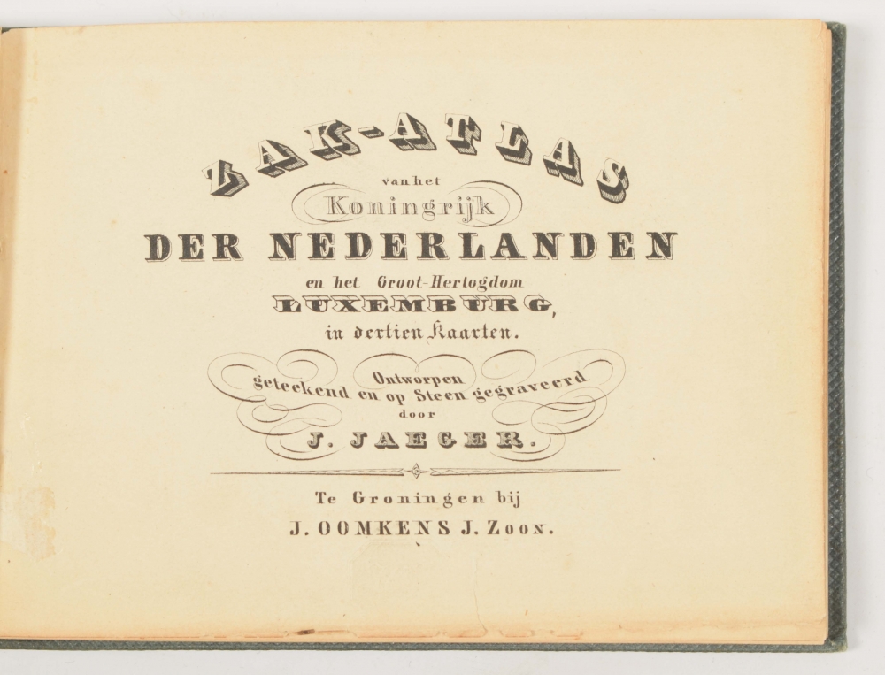 en het Groot-Hertogdom Luxemburg in dertien kaarten. Ontworpen, geteekend en op steen gegraveerd door J. Jaeger. Groningen, J. Oomkens J.Zoon, c. 1850. Oblong 8vo (9 x 13 cm.), green cloth, edges gilt, title on front board, title and maps in lithography.