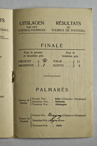 See the Dutch description: Officieel dagprogramma no. 20. Zeldzaam programmaboekje van de finale, Uruguay-Argentinië, die door Uruguay met 2-1 werd gewonnen. (Eindstand net met Oost-Indisch inkt ingevuld), 12 p. Geniet. Omslagontwerp v.d. Hoef.