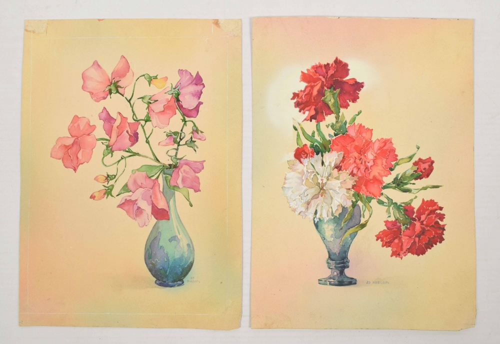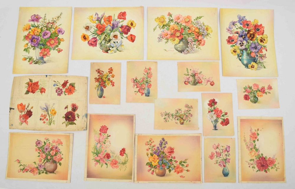 Series of 15 watercolours of flowers, c. 1940, from the archive of publisher Luii. Size varying from 20 x 14 cm. to 24 x 27 cm. - and a sheet with 5 designs for picture postcards or seed pouches, each 10 x 13 cm.