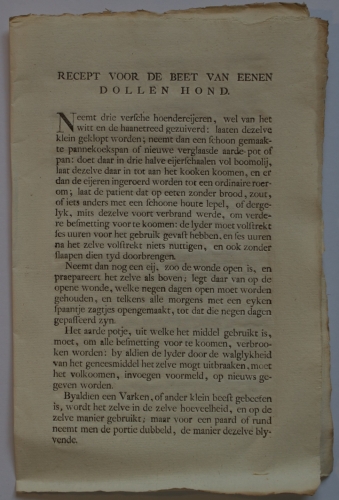 De tekst betreft een (voor de 21e eeuwse mens) volkomen waanzinnige behandeling tegen de beet van een dolle hond. Zeer vermakelijk.