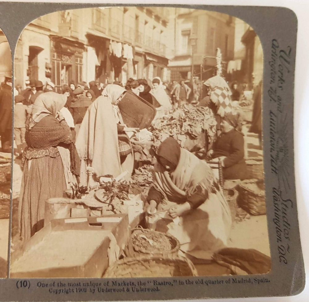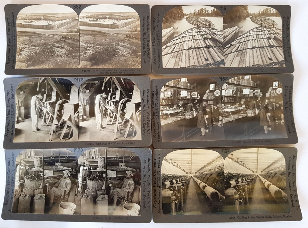 Set of 30 stereo cards related to industry, incl. cork industry Spain, basket weaving Morocco, Rastro market Spain, rice raft South Carolina, coconuts Philippines, pineapples Florida, etc. Issued by Keyston & Underwood.