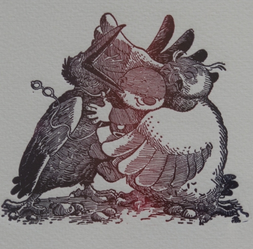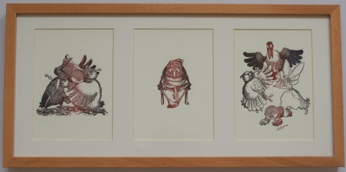 See the Dutch description: Uit Paulus en Priegeltje. Drieluik met Paulus Salomo en Oehoeboeroe, Eucalypta en Priegeltje Paulus, Oehoeboeroe en Salomo. In passe-partout, in lijst. 22 x 49 cm.