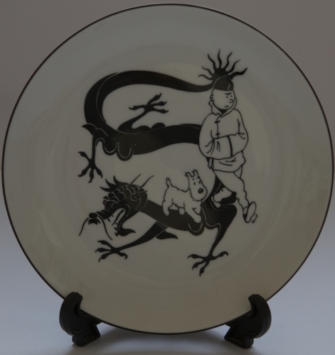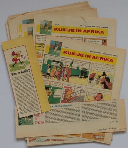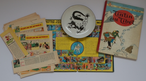 See the Dutch description: [1946], ganzenbordspel met kuifje en bobbie. 29 x 40 cm. op karton. Besch. boven- en beneden middenvouw. + Les aventures de Tintin ; Tintin au Tibet, Casterman, 62 p. geb. met pap. rug, 1960. Redelijk goed ex., knikje l.o. en licht gesch. in hoekjes. + Compleet verhaal Kuifje in Afrika uit de Katholieke Illustratie, 1960 - en porceleinen ontbijtbordje Kuifje, uitg. Axis, Paris.