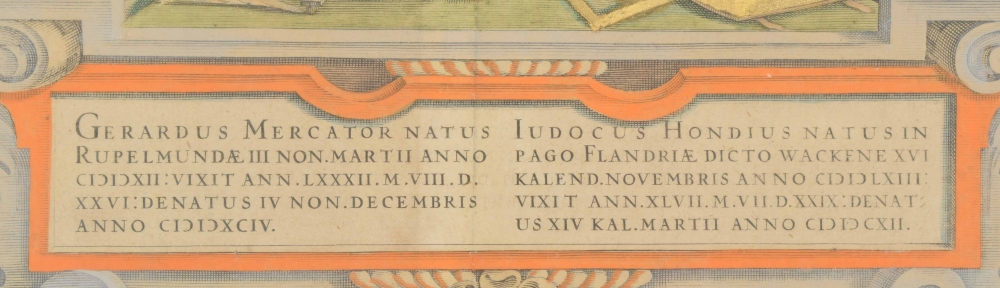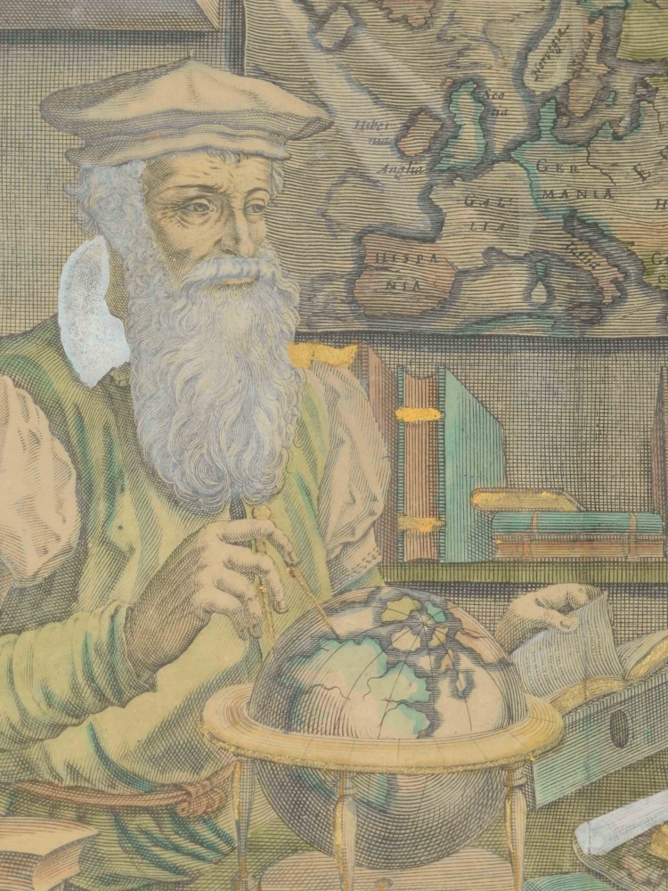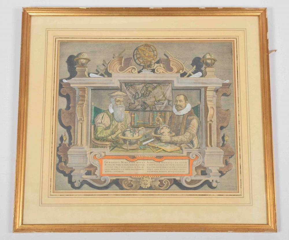 Scholars and cartographers Gerard Mercator (1512-1594) and Jodocus Hondius (1563-1612) depicted together among their instruments related to their profession. Both have made maps and globes of the world and the sky and constructed astronomical instruments. The portrait appeared in multiple places, incl. in 1613 in Mercator's 'Atlas', published by Jodocus Hondius in Amsterdam. Partly antiquely coloured, partly with additional colouring. Heightened with gold. Framed in mount under glass. Frame 57 x 63 cm. Image 39 x 45 cm. Frame sl. dam. Print in very good condition.