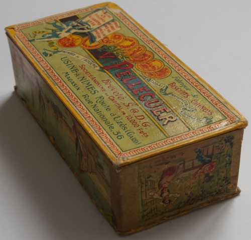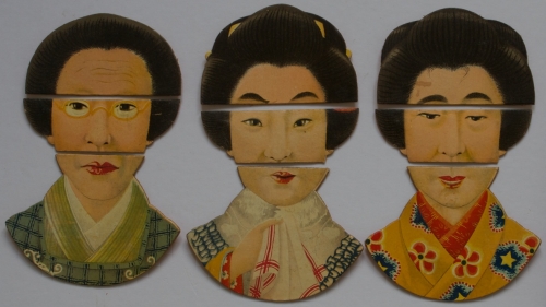 See the Dutch description: Shozo Asobi, wisselgezichtenspel met 6 x 3 mogelijkheden, ca. 1920 in orig. doos. + Kartonnen verpakkingsdoos 15,5 x 7,2 x 4,1 cm. V. Pellecuer, fabrique de Biscuits Chinois, Nimes, ca. 1905. + 2 andere doosjes uit dezelfde tijd + een tasje - en een set kaarten.