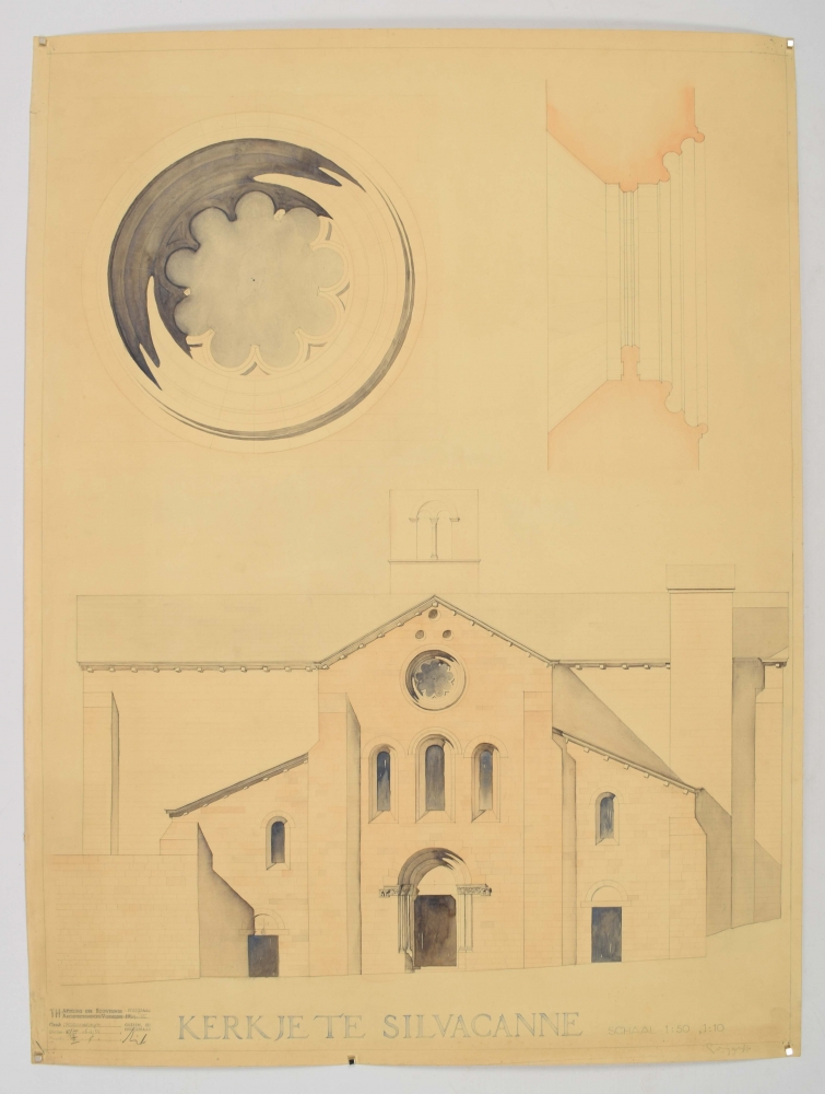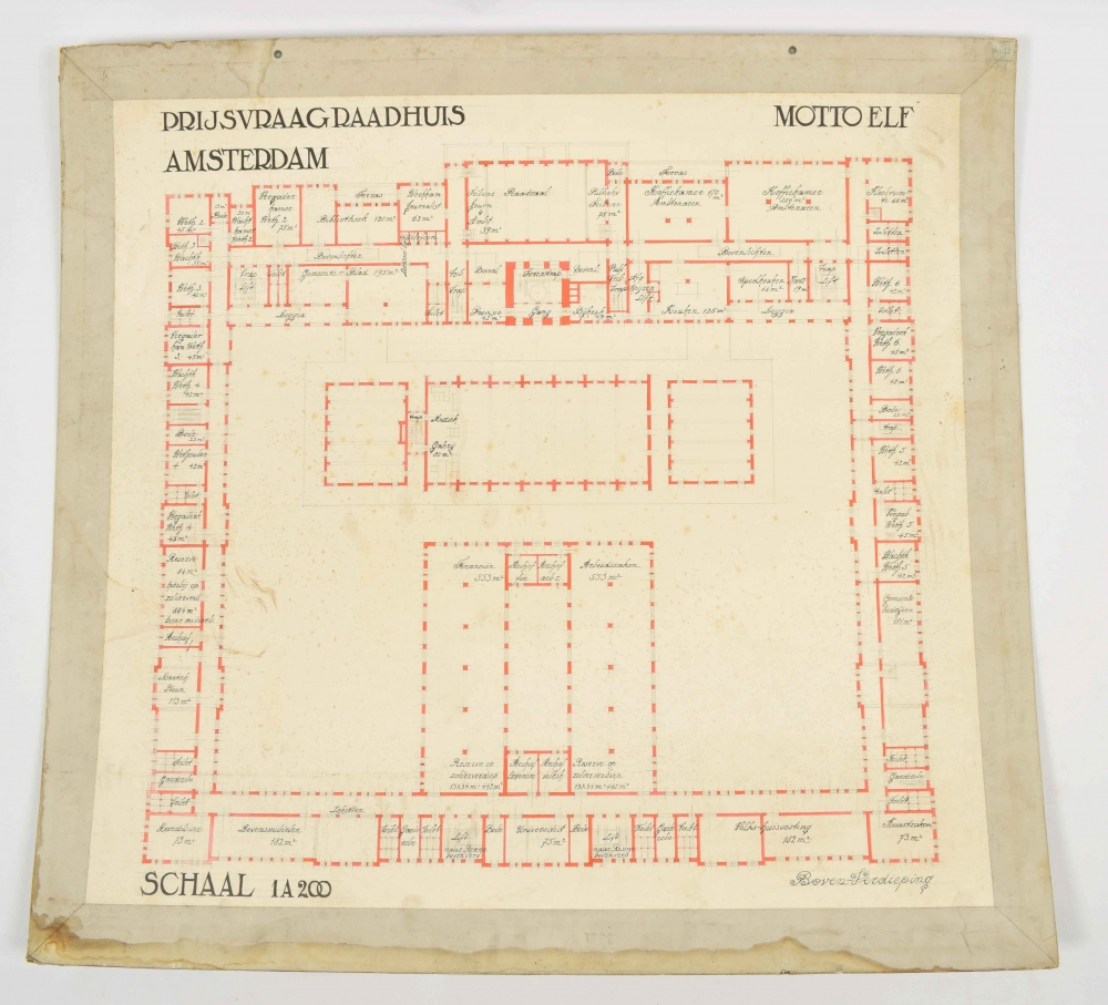 8 design drawings for one of the submissions for the Amsterdam town hall design contest, 1936: (1) Zuidoostzijde, 74.5 x 50 cm, sl. foxed; (2) Noordwestzijde, 74.5 x 50 cm, soiled; (3) Zuid-Gevel & Noord-Gevel, 74.5 x 69 cm, some staining; (4) West-Gevel & Oost-Gevel, 74.5 x 69 cm, some staining; (5) Plan beganen Grond, 74.5 x 69 cm, red ink sl. run off; (6) Hoofd-Verdieping, 74.5 x 69 cm, sl. stained; (7) Kelderplan, 74.5 x 69 cm, some staining. With mounted paper strips on ends; (8) Boven-Verdieping, 74.5 x 69 cm, some soiling. All drawings on paper, mounted on cardboard, perspective drawings in black ink finished with watercolour, plans in red ink with ann. in pen. Sizes excl. margin. The plates with inscription: Motto Elf and on the edge: No. 052. A few edges waterstained. Plates with double perforation in head margin + added file with ± 75 blueprints and design drawings for buildings, structures, furniture etc., incl. for the Laboratorium voor Microbiologie at Wageningen, built between 1920 and 1922. 75 x 60 cm. Circa 1910-1925. Mostly in good condition, several with frayed paper edges or folds. Pencil with watercolour. On reverse sketches in pencil + 2 later architectural design drawings, made by students at the T.H. Afdeling der Bouwkunde, 89 x 67 cm, 1954-1955. Pencil with watercolour.