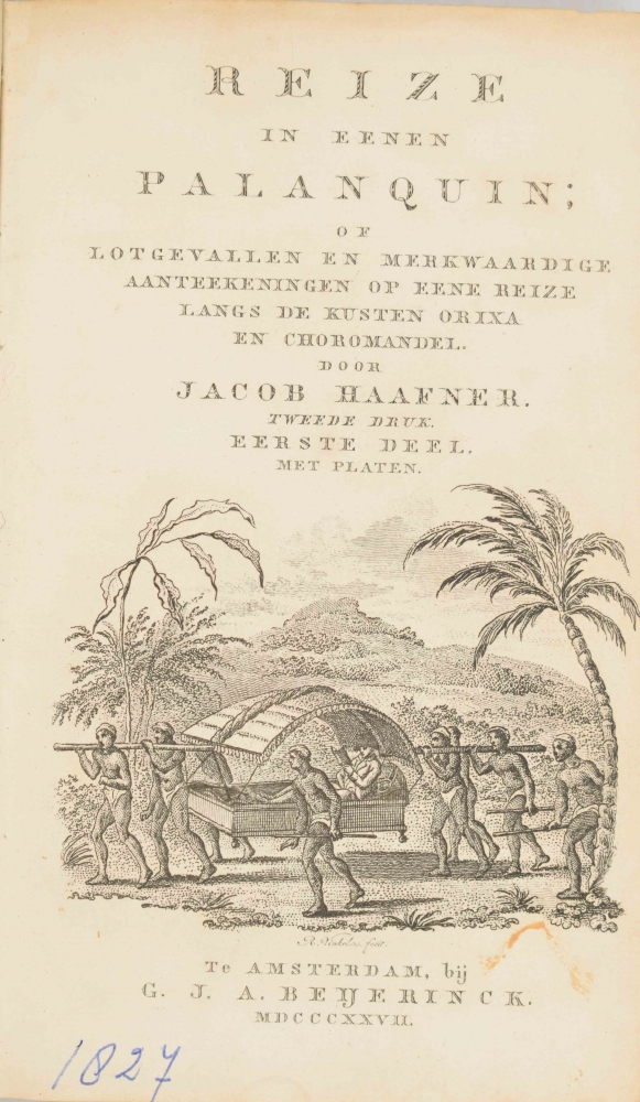 Of lotgevallen en merkwaardige aanteekeningen op eene reize langs de kusten Orixa en Choromandel. Jacob Haafner. [2 parts in one vol., 2nd ed.]. Amsterdam, G.J.A. Beijerinck, 1827. Small 8vo, cloth, title on spine in gilt stamping. Parts I and II with title engraving by R. Vinkeles, part I with a folding copper engraving and 3 full-page handcoloured engravings, part II with 2 folding copper engravings and a full-page handcoloured engraving. All engravings by R. Vinkeles. Very good and complete copy of this voyage along the Indian coastal provinces of Choromandel and Orixa.