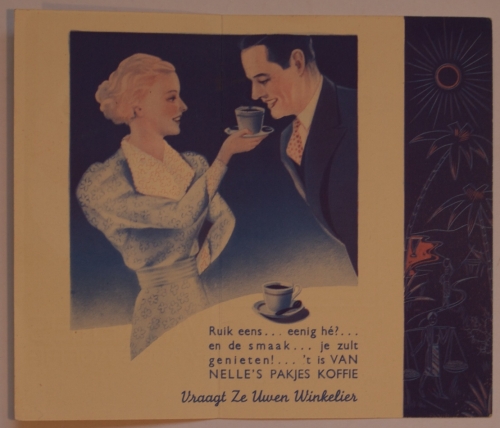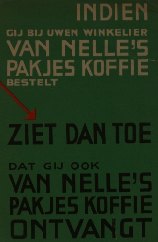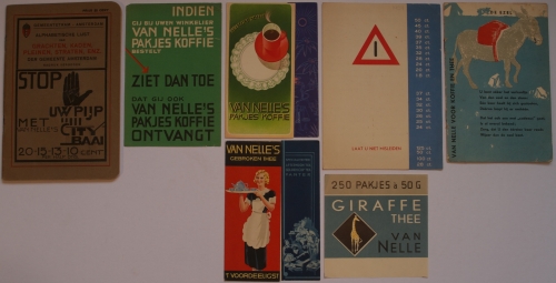 See the Dutch description: "Indien gij bij uwen winkelier Van Nelle's pakjes koffie bestelt (...)", flyer gedrukt in zwart, wit en rood op een groene achtergrond, 15,5 x 10,5 cm., twee kleine scheurtjes. "Laat u niet misleiden", gevouwen folder op dik papier, gedrukt in blauw, rood en geel, 18x22 cm., aantrekkelijke vormgeving. "Heerlijke koffie. Van Nelle's pakjes koffie", gevouwen folder op dik papier, gedrukt in groen, rood en blauw - en 4 anderen vergelijkbaar.
