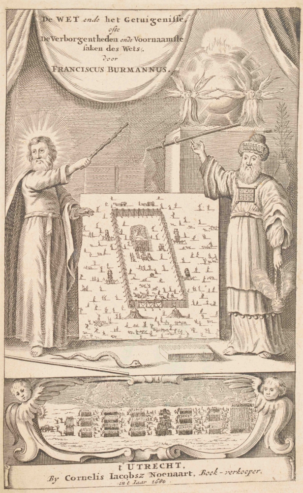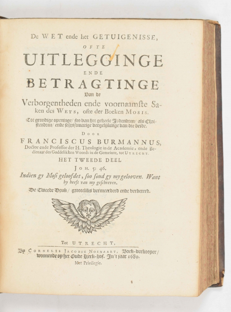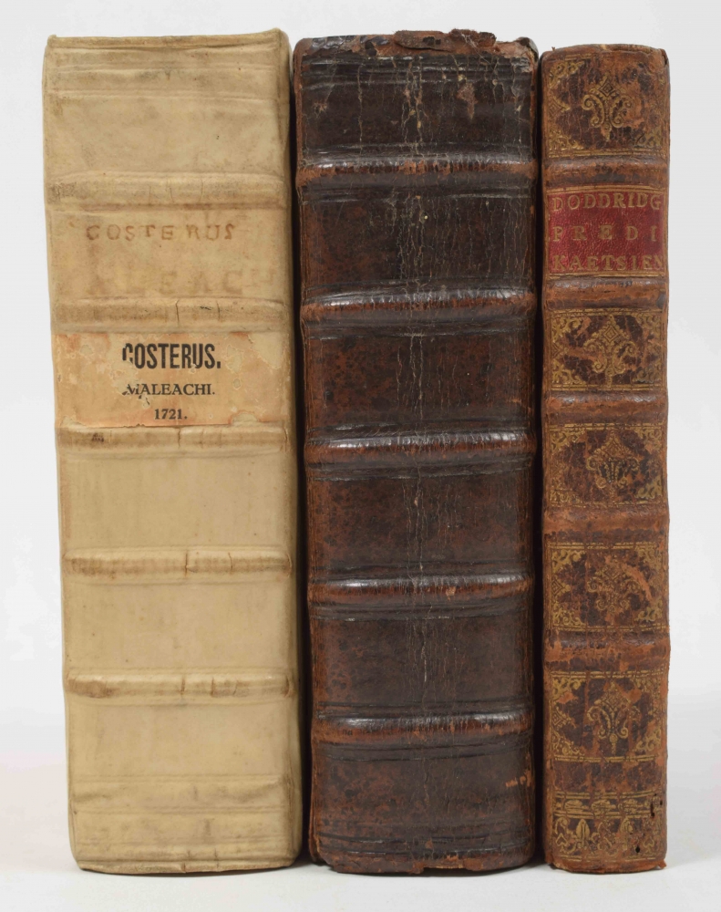 Van de Verborgentheden ende voornaamste Saken des Wets, ofte der Boeken Mosis. [2 parts in one vol.]. Franciscus Burmannus. Utrecht, C.J. Noenaart, 1680. Small 4to, leather, blindstamped, illus. frontispiece, 2x title with small vignette, (1),(48),650 (= 950) pp. + index. Good copy. (2) De Propheet Maleachi in XXXVI Leerredenen verklaert (...) Johannes Costerus. Delft, Adriaan Beman, 1721. Small 4to, vellum, blindstamped, title in red and black with vignette. Good copy. (3) Tien Predikaetsien over de Kracht en Genade van Christus (...). P. Doddridge (trsl.). Wilhelmus Peiffers. Amsterdam, Van Gerrevink etc., 1748. 8vo, title in red and black with small vignette. Good copy.