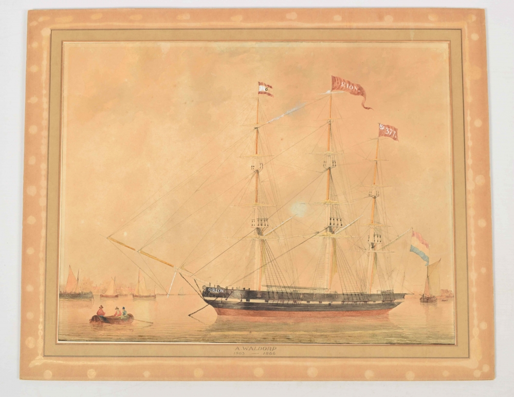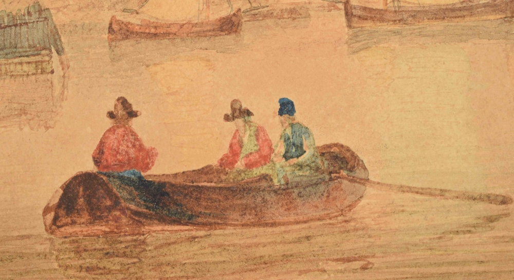 Drawing in pen and ink, finished as watercolour, 41.5 x 53 cm., mounted on holder in mount with attribution bottom centre.