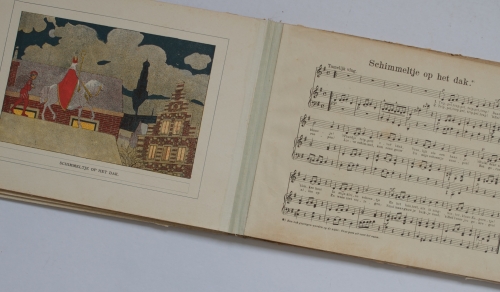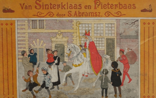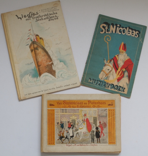 See the Dutch description: Liedjes: Opnieuw bijeengebracht door Dr. Cornelis aan 't Zevenend te Laren. Prentjes Popje Hage. Een Ouderwetsche Sinterklaasavond. Met kleine wijzigingen naar het tijdens de oorlog clandestien verschenen origineel. Jos. M.H. Nuss, Laren, ca. 1946. 20 p. + Inlegvel. + Van Sinterklaas en Pieterbaas door S. Abramsz., P. van Belkum Az. te Zuphen, 2e dr., 1919. Gebonden, oblong, met linnen rug. Ills. Jan Franse. Wat sleets aan randen, redelijk goed ex. - en 1 andere.