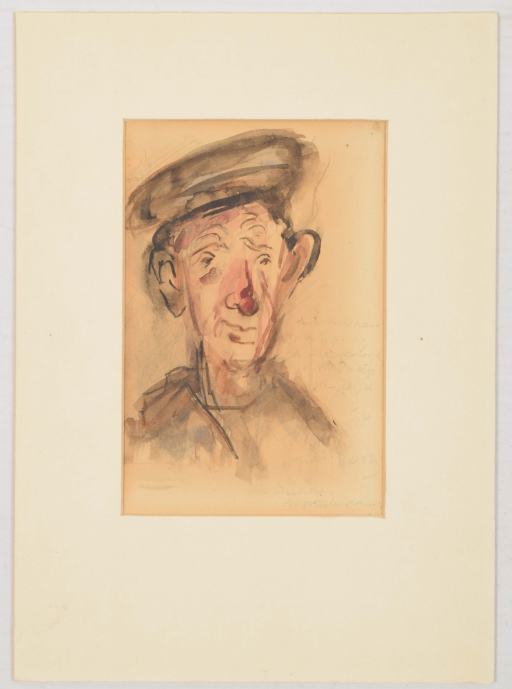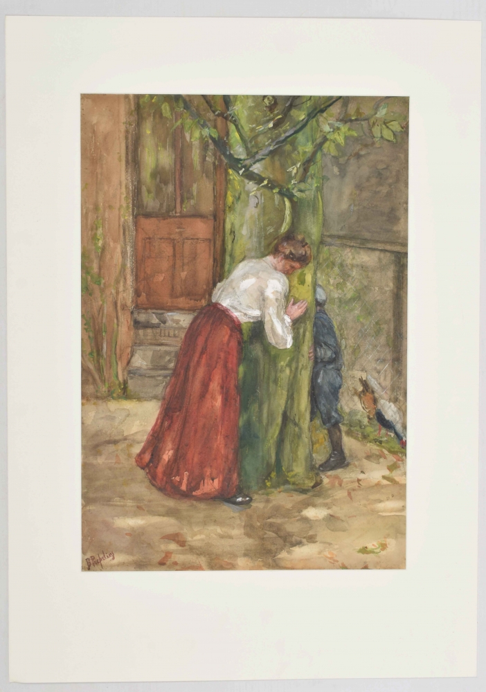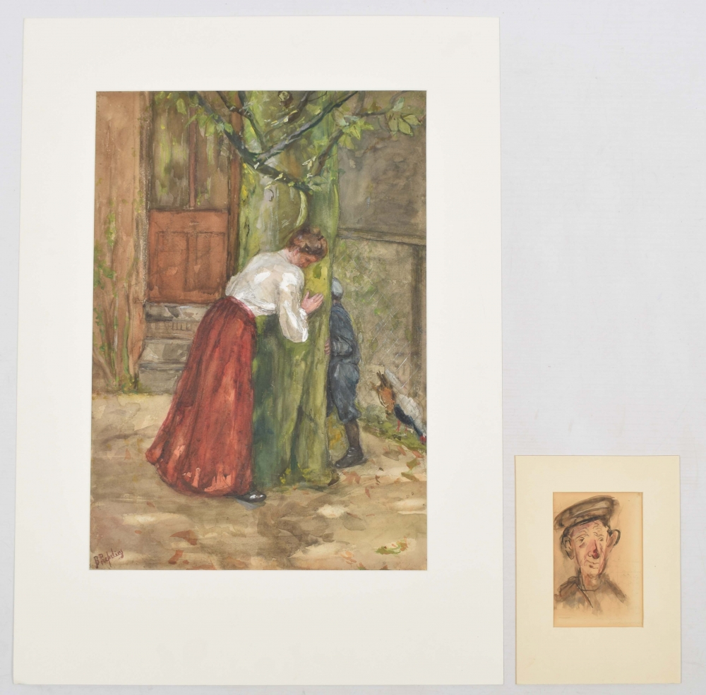 Verstoppertje Spelen. Watercolour, undated. Signature lower left, 50 x 34 cm. In mount. Added: Mannetje uit Monnickendam. Watercolour. Illegible signature, dated 1923. 14 x 9 cm. In mount.