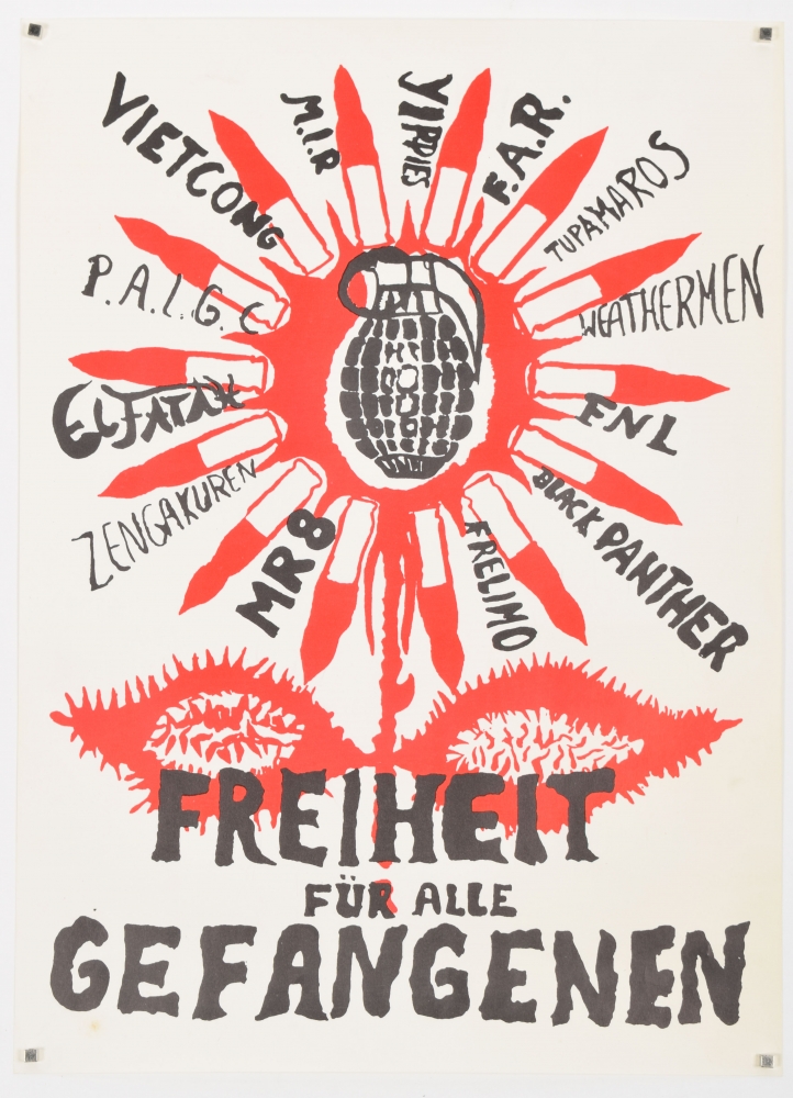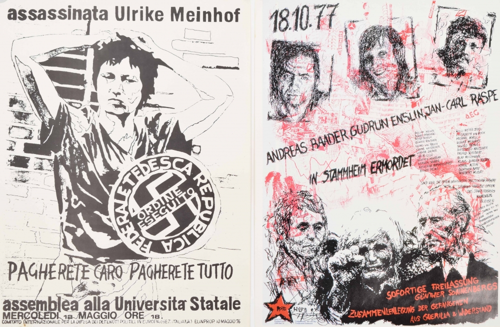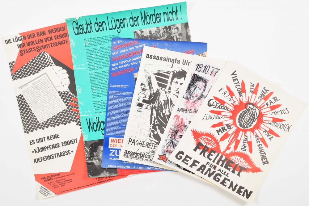 Federaletesca Republica Ordine Esequito + 18-10-77 Andreas Baader Gudrun Enslin Jan-Carl Raspe in Stammheim ermordet + Wolfgang Gras/ Birgit Hogefeld - and 3 related posters concerning the release of prisoners affiliated to RAF and similar organisations.
