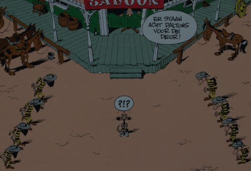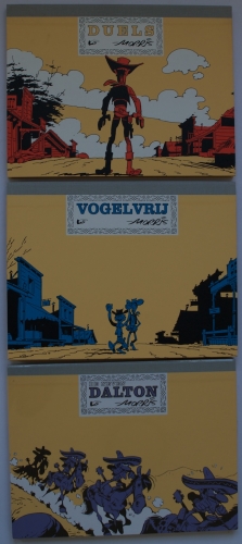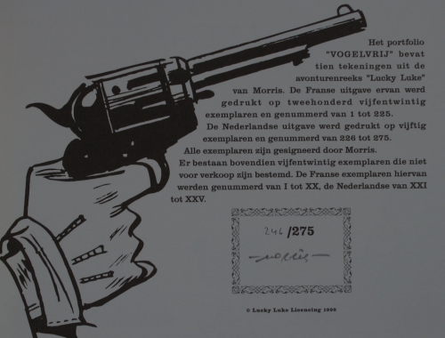 See the Dutch description: Duels, Lucky Luke licensing, 1999. Portfolio met daarin 10 prenten. De Franse oplage bedroeg 225 ex. De Nederlandse voor de verkoop bedoelde oplage bedroeg slechts 50 exemplaren, nrs. 225-275. Dit is nr. 243, gesign. door Morris. + Vogelvrij, (idem, nr. 246) - en De neven Dalton (idem, nog in folie)