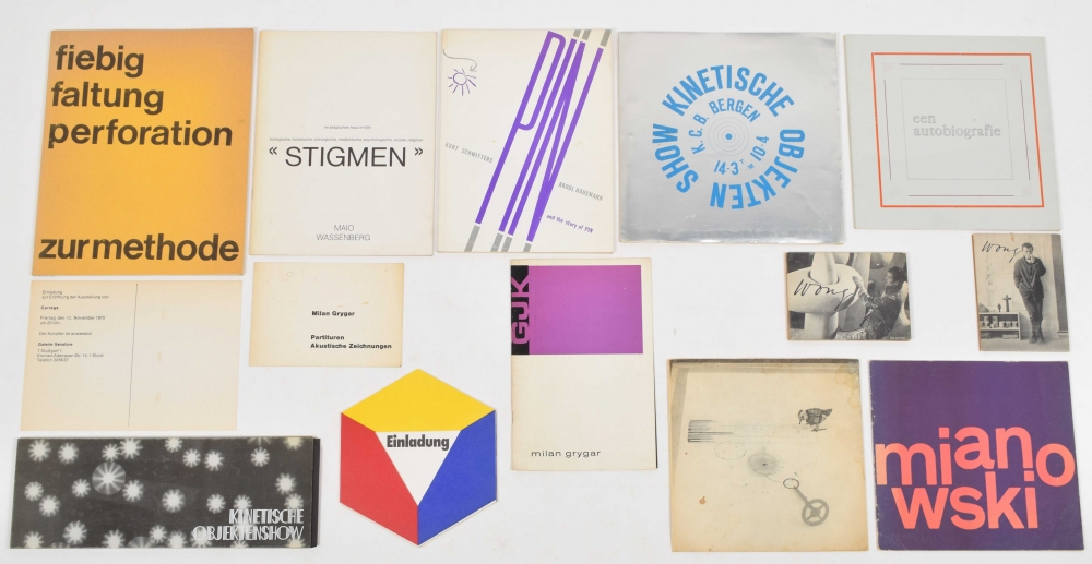 45 rpm. Supraphon, 1969. Small damp patch upper r. + 2 gallery invitations for exhibitions in 1969 + Einladung zur Eröffnung der Ausstellung von Carrega 13 nov. 1970 in Galerie Senatore + Kinetische Objektenshow, Groninger Museum, De Hallen and others, 1969. Leaves partly loose, incl. invitation + Show Kinetische Objekten. K.C.B. Bergen 14-3 tm 10-4. Jos Wong. + 1 more by Jos Wong + Einladung zum Besuch der Zweiten Biennale Nürnberg, 30 April 1971 - and 5 more.