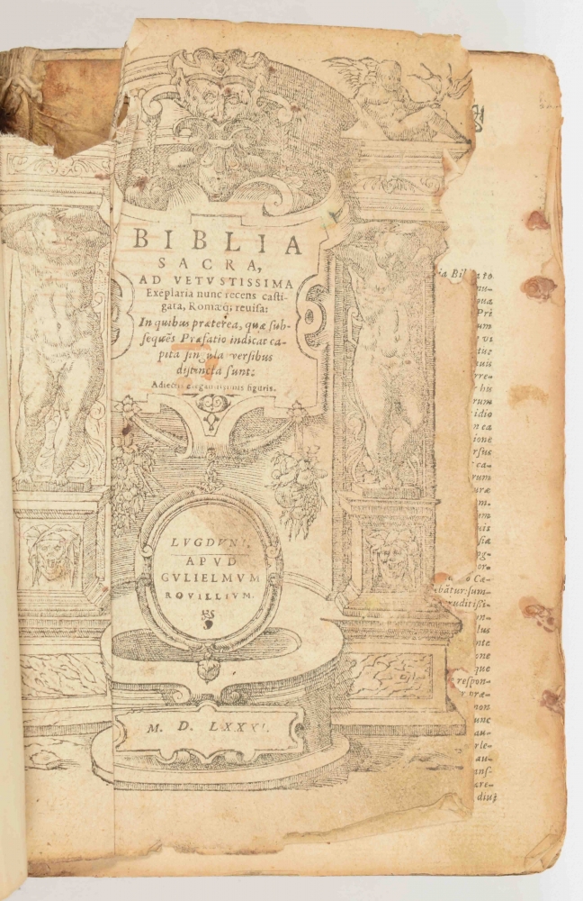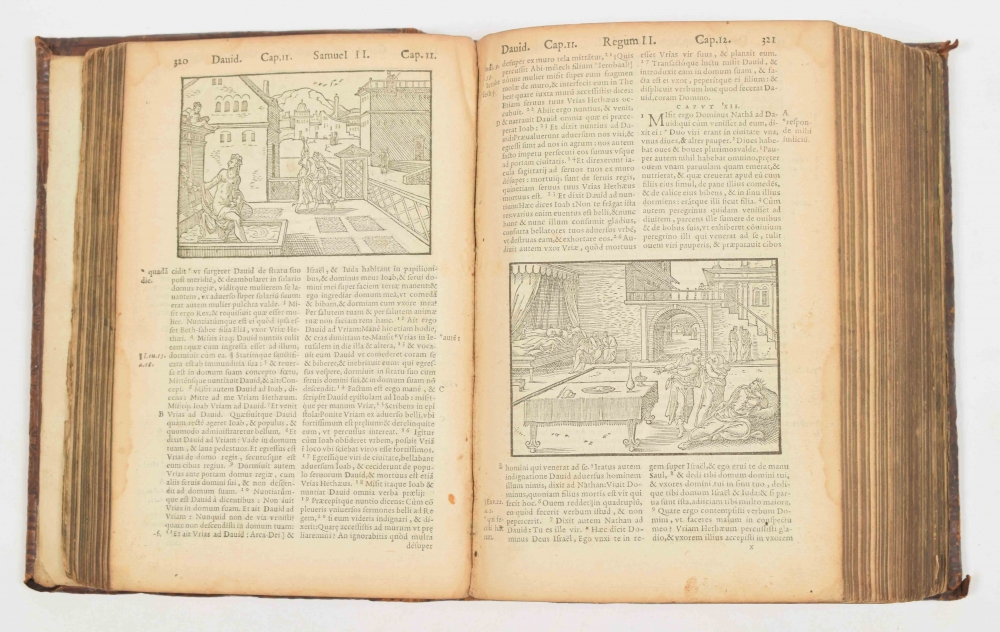 Exe[m]plaria nunc recens castigata Romae q[uae] revisa (...) Lyon, Guillaume Rouillé, 1581. Small 8vo, illus. and blindstamped leather binding (16th-century (?), not the original binding), illus. title page, (16),1114 pp. + 4 indices. Numerous woodcuts (8 x 5,5 cm) with mostly biblical scenes in the text.