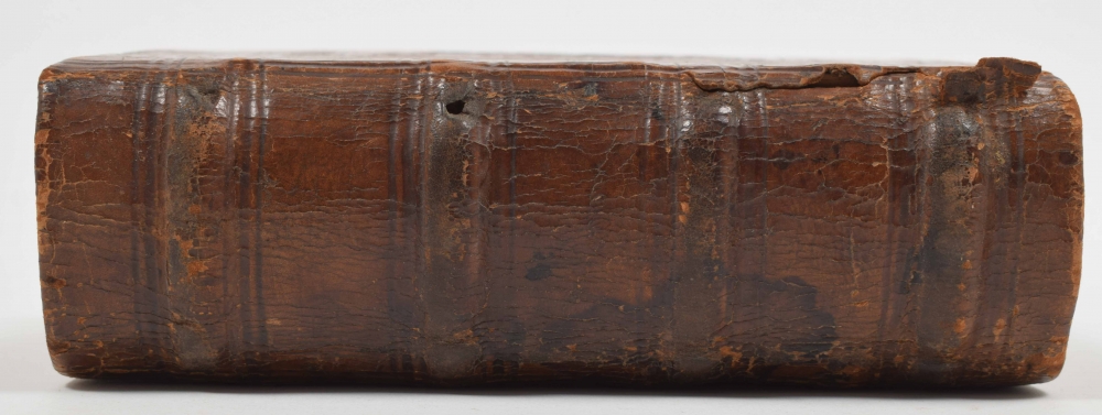 Spine with dam., binding mounted the wrong way around. The front board (now back board) with Christogram and from the foundation of the Jesuit order the emblem of the Jesuits, recognisable by the three nails below the emblem; the back board (now front board) with image of Mary with the child Jesus. Incomplete copy (lacks several pp.). Bookplate of A. Pitlo. Sold as seen w.a.f.