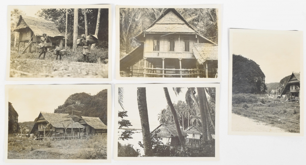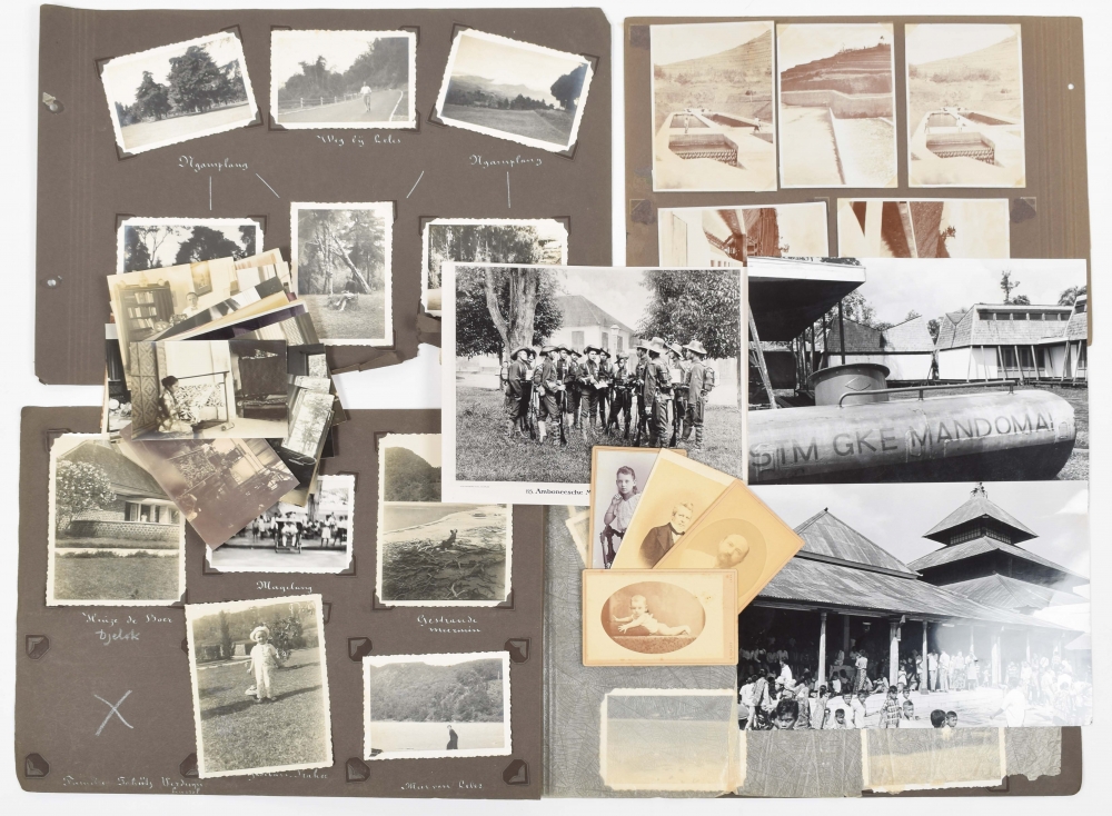 Lot with 42 photographs and cartes de visite from Indonesia 1880-1930. Incl. photos fo two men in library with leopard skin and arrow tube; floating houses; pirogues; cartes de visite of R. Schütz, Jave; Koene & Comp., Batavia; Woodbury & Page, Java (dated by hand 1887 on back) and 4 other by same photographer; J.F. Donkers, Soerakarta Java; J.H. de Bruijn, Samarang and more + over 200 photos regarding Dutch East Indies [current Indonesia], all laid into binder. Incl. kampongs, taxis in cities, a trip on Lombok, fishermen, etc. various sizes -and photo report Zendingshulp Indonesië 1960-70s. 20 photos, incl. College Hogeschool Timor, photographer Jaco Klamer, Exterior hostpital Bethesda, Java and several soldiers on Java. Each 17 x 24 cm.