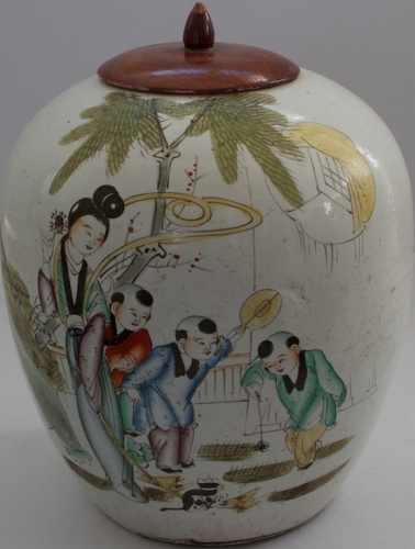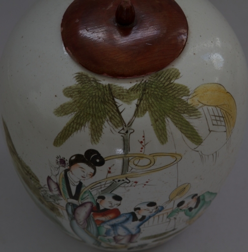 See the Dutch description: Begin 19e eeuw. 24 cm. hoog, diameter 20 cm. Tekst aan een zijde, aan de andere zijde een tafereel van een vrouw en kinderen die met een jong poesje spelen. Met houten deksel.