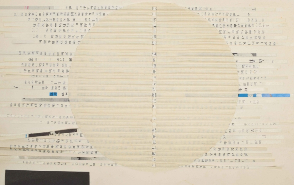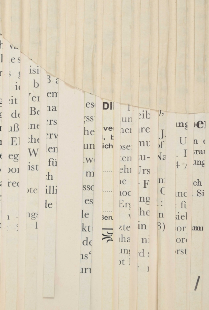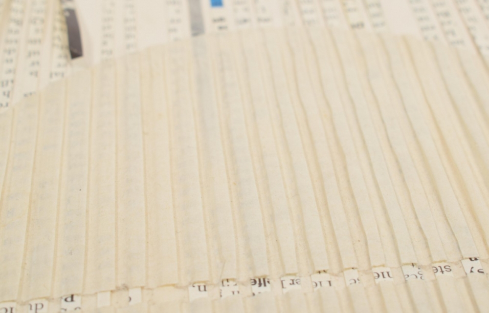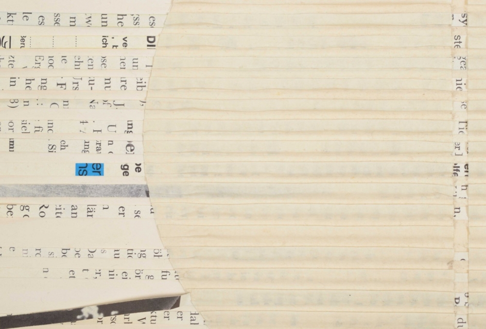 The 26 long text strips cut out of magazines can be slided to generate a new arbitrary text. Three corners of the box are torn. Overall aging and staining on the box and the cardboard. Not in perfect state, but still a beautiful item.