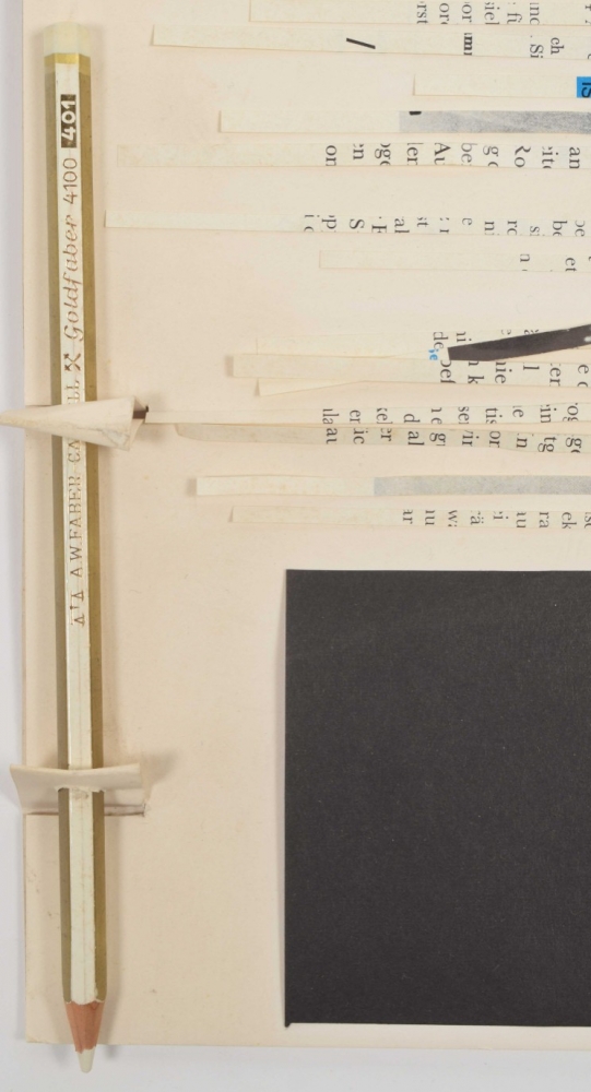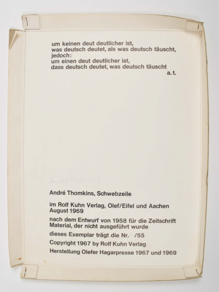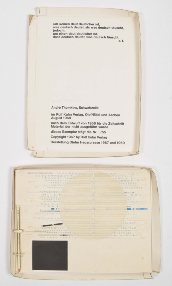 Eifel/Aachen, Rolf Kuhn Verlag, 1969. Construction with pull-strips, note block and pencil on cardboard, assembled into a white box. Edition of 55, all unique. 26 x 27 x 2.5 cm. Signed and numbered on inside of the lid, this is No.12.