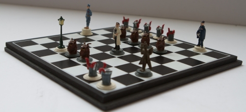 See the Dutch description: Jeu d'Echecs, Pixi Mini, Casterman/Tardi 1997. In oplage van 350 verschenen. Genummerd exemplaar. Miniatuurschaakspel met handgekleurde metalen figuren uit de verhalen van Tardi. In originele doos. Inclusief certificaat.