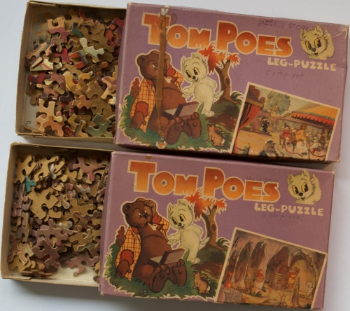 See the Dutch description: De Muinck & Co, Amsterdam, 1947: Op de Kermis (=Santbrink, 1988 p. 47: 5.1) en De schatten van Pikkin. Beide in orig. doos. Een elastiekstrook is aan de voorzijde van de doos blijven kleven. Verder compleet en in goede conditie. + Victoria puzzel in envelop, 1979 - en Aap te Paard, ca. 1950. Doos aan randen besch.