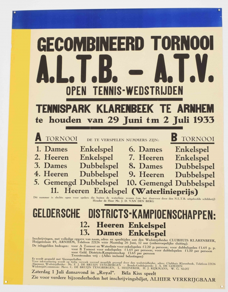 Open Tennis-wedstrijden tennispark Klarenbeek te Arnhem te houden van 29 Juni tm 2 Juli 1933. Added: Algemeene herdenking van Prins Willem van Oranje, 5 mei 1933 + Hier wordt de electrische installatie verzorgd door N.V. installatie-bedrijf F.J. de Greef Arnhem. C. 1933 (2x) - and Afhalen, vervoeren, bezorgen. ATO. Vlugger, goedkoper. N. Sickenga, 1931. Paper gnawed upper l.