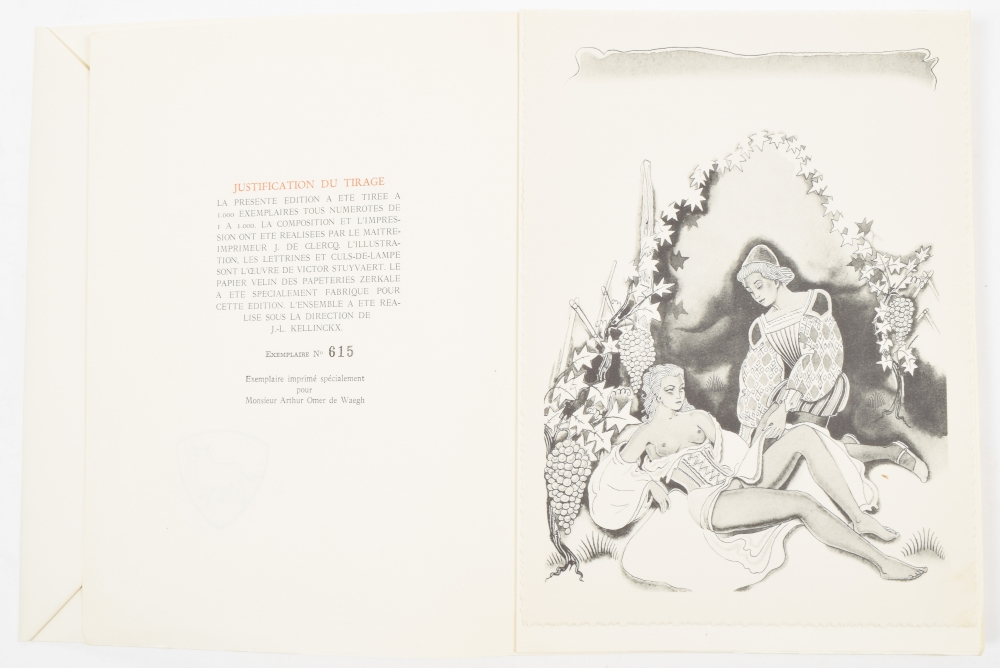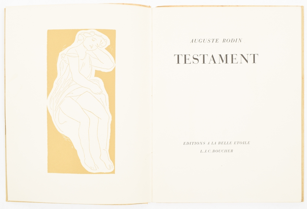 Paris, Prétextes, 1946. Copy no. 186. In loose quires as issued with pictorial wrapper in orig. box. Box sl. toned + 2 other Baudelaire editions + La Rome des Borgia. Apollinaire. Brussels, Kellinckx, 1956. In loose quires as issued with pictorial wrapper in loose binding. The ensemble together in slipcase. Copy no. 615 in name of Arthur Omer de Waegh. Incl. loose print. Binding sl. worn + Testament. Auguste Rodin. Boucher/ Éditions à la belle étoile, 1948. Edition of 40 copies - and 2 more.