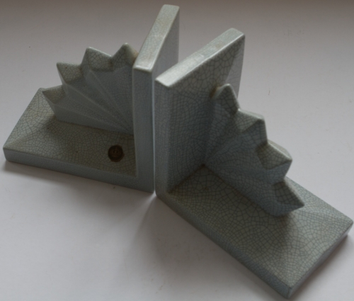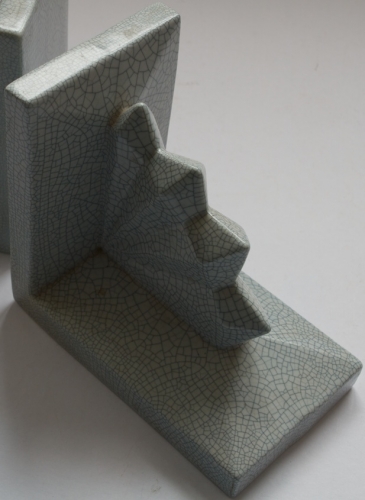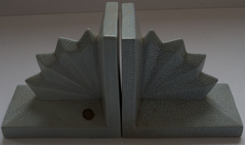 This item contains no English description. See the Dutch description: Nimy, België. Boekensteunen met waaiervormversiering. Blauw-beige craquelé. 16,5 x 17,5 x 10,5 cm.