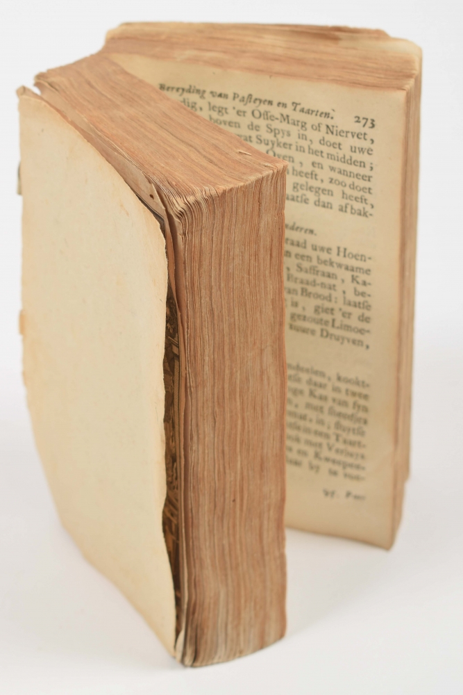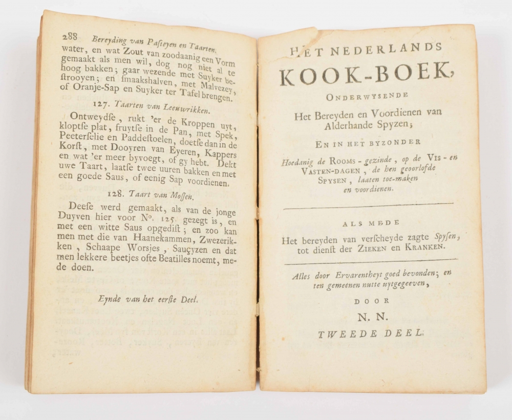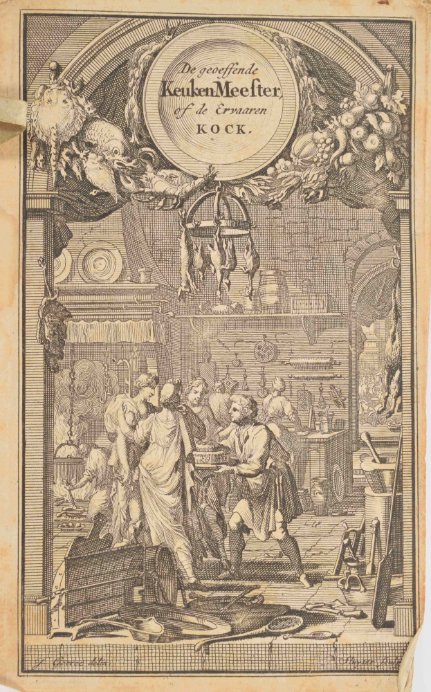 Onderwysende, hoe dat in Engeland, Vrankryk, Italien, Duytsland, &c. alderhande soorten van spysen (...) Insgelyks ook een byzonder kook-boek tot dienst der rooms-gesinde in de visch en vaste-dagen (...) Als mede het bereyden van verscheyde sagte Spysen (...). Amsterdam, Gerrit Tielenburg, 1737. (4), 247 p. Engraved frontispiece. Orig. wrapper, 16 x 10 cm. Lacks front wrapper and spine, front endpaper and frontispiece loose, several pp. waterstained.