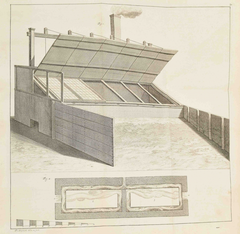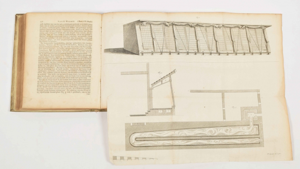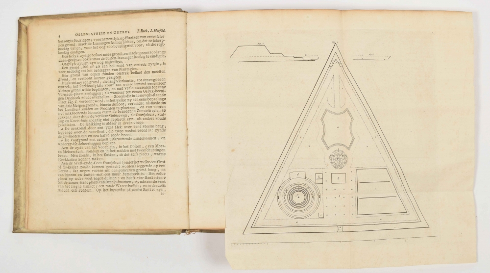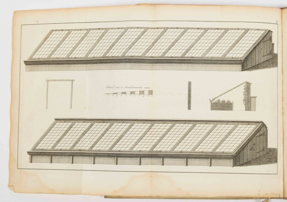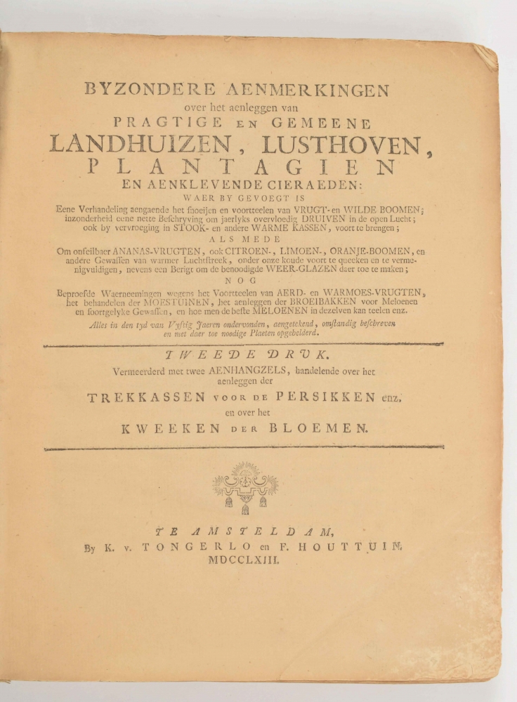 gemeene landhuizen, lusthoven, plantagien en aenklevende cieraeden: waer by gevoegt is een verhandeling aengaende het snoeijen en voorttelen van vrugt- en wilde boomen; inzonderheid eene nette beschryving om jaerlyks overvloedig druiven (...) voort te brengen als mede om onfeilbaer ananas-vrugten, ook citroen-, limoen-, oranje-boomen, en andere gewassen van warmer luchtstreek, onder onze koude voort te queeken en te vermenigvuldigen, nevens een berigt om de benoodigde weer-glazen daer toe te maken (...) [by Pieter de la Court van der Voort]. 2nd ed. Vermeerderd met twee aenhangzels, handelende over het aenleggen der trekkassen voor de persikken enz. en over het kweeken der bloemen. Amsterdam, K. van Tongerlo & F. Houttuin, 1763, 2 parts in one vol. with consecutive paging, (4),XII,(4),522,(18) p., with per binder's index 16 engraved plates (most folding) by J. v.d. Spyk, F. van Bleyswyck, J. Wandelaar and J.C. Philips.