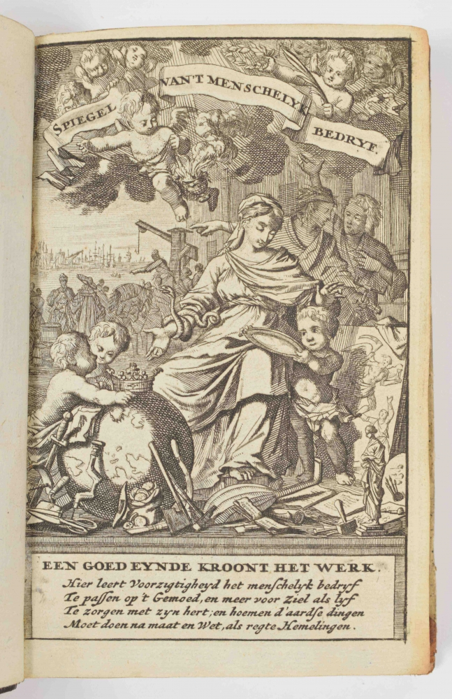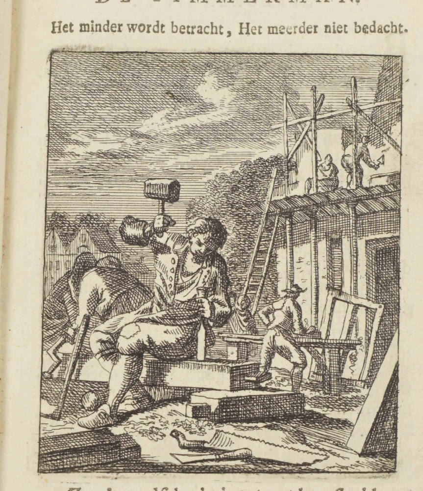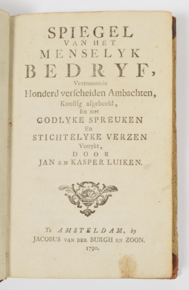Vertoonende Honderd verscheiden Ambachten, Konstig afgebeeld, en met Godlyke Spreuken en Stichtelyke verzen verrykt door Jan en Kasper Luiken. Amsterdam, Jacobus van der Burgh en zoon, 1790. (4),208,(3) p. Engraved frontispiece and more than 100 engravings in the text. 19th-century halfleather, 8vo, gilt title vignette on spine.