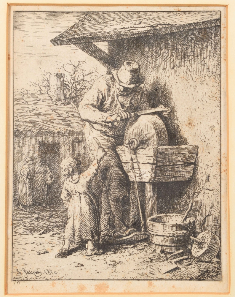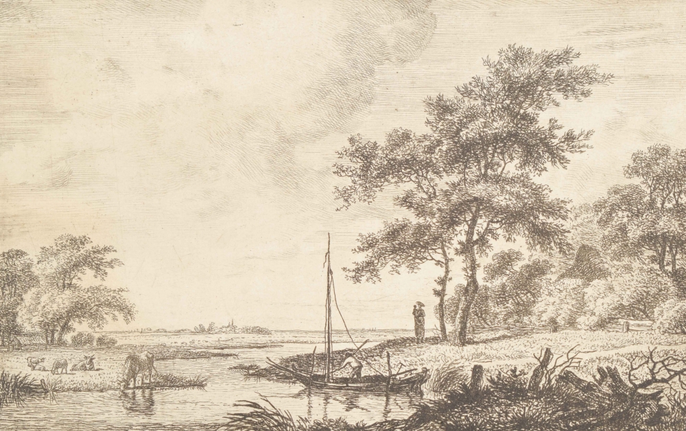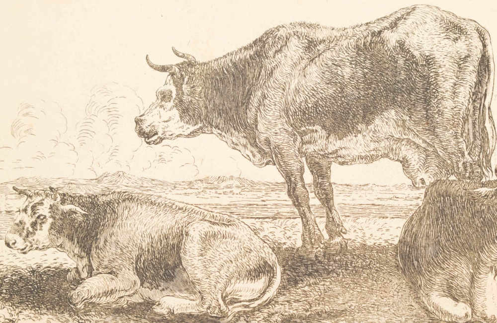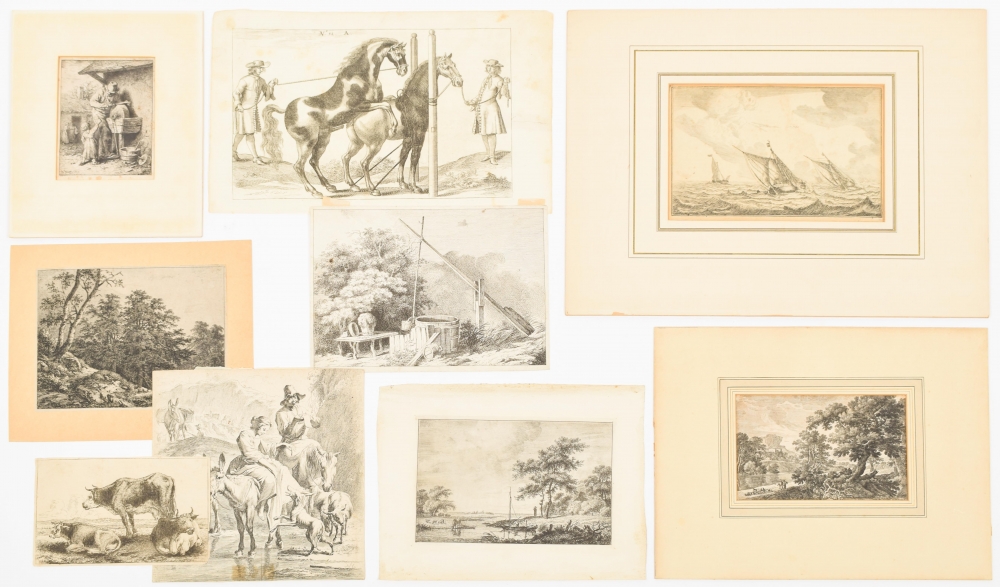 Sl. tanned; with note in pencil on mount: "Editie 1795"; Hollstein 106, 2nd and last state; (2) Jan van den Hecke I (1619/20-1684). (Three cows). Etching, 10.3 x 16.2 cm. Tear and missing pieces in right margin. Dutuit 32. With collector's mark C.W. Lüdert verso (Lugt 1697, c. 1860); (2) Hermannus Fock (1766-1822). (River scenery with cows and sailing boot). Etching, 11.7 x 8.5 cm. Hippert & Linnig 26, 3rd and last state - and 6 more, incl. a beautifully made etching of a stud servicing a mare, supervised by two men. (total 9)
